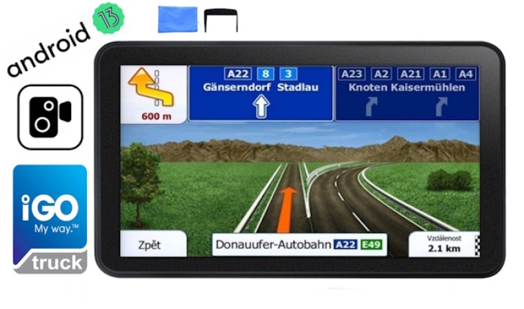 NOVINKA GPS navigace Android 2025 s kapacitním HD displejem s rozlišením 1024x600, paměť 2GB/32GB, rychlé nabíjení USB-C a duální Wi-Fi 2,4/5GHz s mapami 47 států + aktualizace doživotně 2x ročně Oblíbená navigace s iGO. S podporou oblíbených aplikací přímo z Google store.
